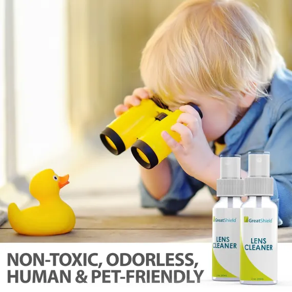GreatShield Lens Cleaner Spray Kit is designed with a special formula that is clear and odorless while providing maximum effectiveness at removing unwanted fingerprints and grime. This package includes two 2 ounce spray bottles capable of cleaning over 500 lenses and two microfiber cleaning cloths.