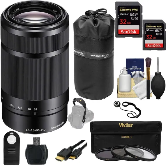 Sony E 55-210mm f/4.5-6.3 OSS E-Mount Lens OSS with 2x 32GB Sandisk Extreme PRO, Filter Kit, Hand Strap, Cleaning Kit & Case Bundle