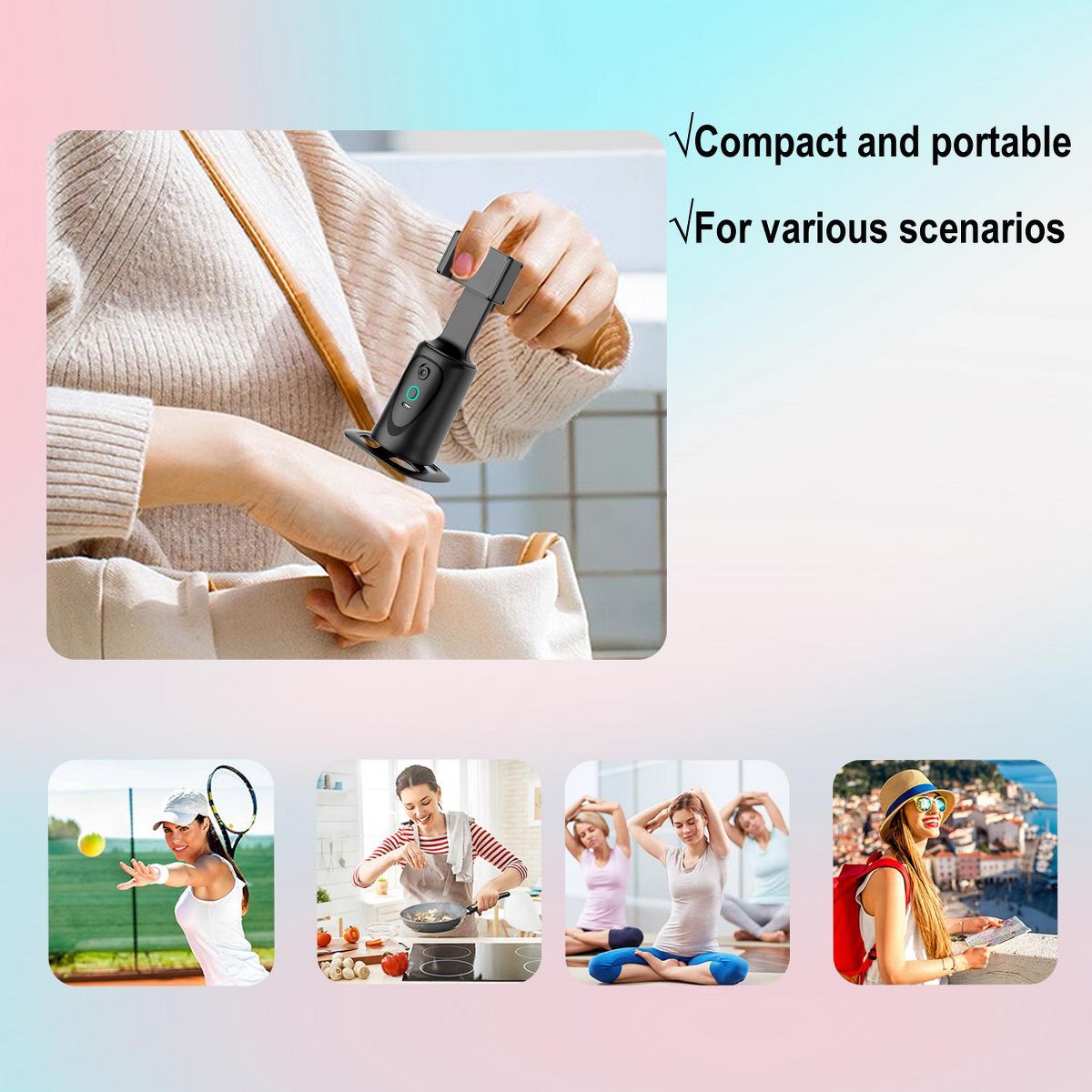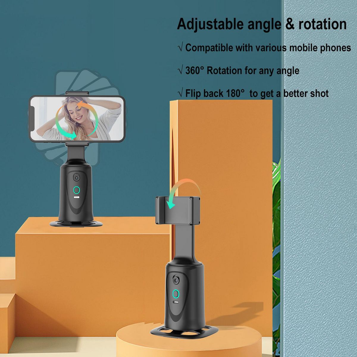 This smart tracking smartphone gimbal stabilizer features an AI computing system that automatically recognizes and tracks your face or body, rotating 360° steadily with your movement—perfect for hands-free live streaming, Vlogs, TikTok, YouTube videos, and Zoom calls. No app download or complicated setup needed: just adjust the angle, press the start button, and use it immediately, making it user-friendly for both beginners and professionals. Equipped with dual control modes (wireless remote + gesture recognition), it offers flexible operation: the advanced gesture algorithm responds to simple commands, while the remote lets you control shooting from a distance. With a 105° lens field of view and 42° per second rotation speed, it ensures you stay the focus wherever you move. The bottom features a standard 1/4-inch thread, compatible with most tripods for easy angle and height adjustment. Built with a rechargeable battery, it’s a cost-effective, professional assistant for automatic video and photo shooting.
