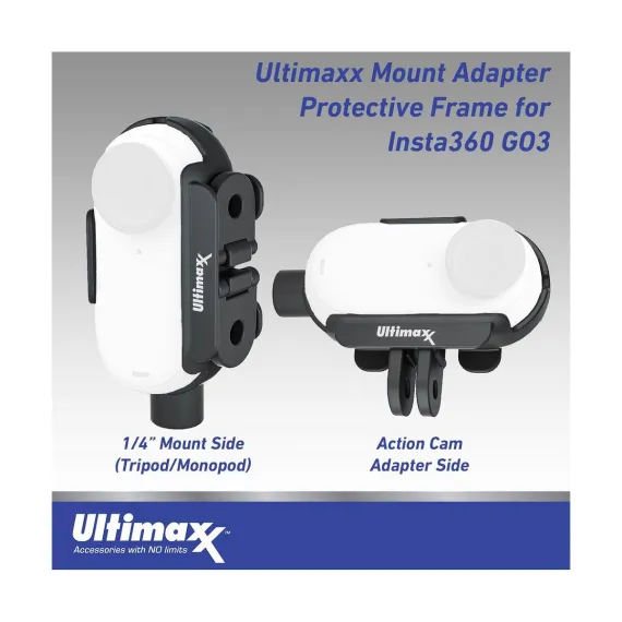 The Ultimaxx Mount Adapter Protective Frame for GO 3 supports both horizontal and vertical shooting with a 1/4in adapter and an action camera adapter. Foldable Design. While using 1/4in port, you can make action camera adapter "invisible" by folding it to the mount. The specially designed mount can perfectly fit GO 3 and lock it tightly.