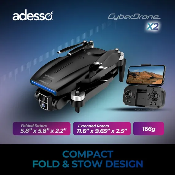 The Adesso® CyberDrone X2 is a lightweight and portable drone equipped with a 1080p FPV camera and a gimbal for stable, high-quality video and photo capture. It offers dual control options via a 2.4-GHz remote controller or a mobile app, giving users flexible ways to pilot the drone. With a 262-ft. control range, it provides a reliable and responsive flying experience, making it ideal for capturing aerial footage or enjoying scenic flights.