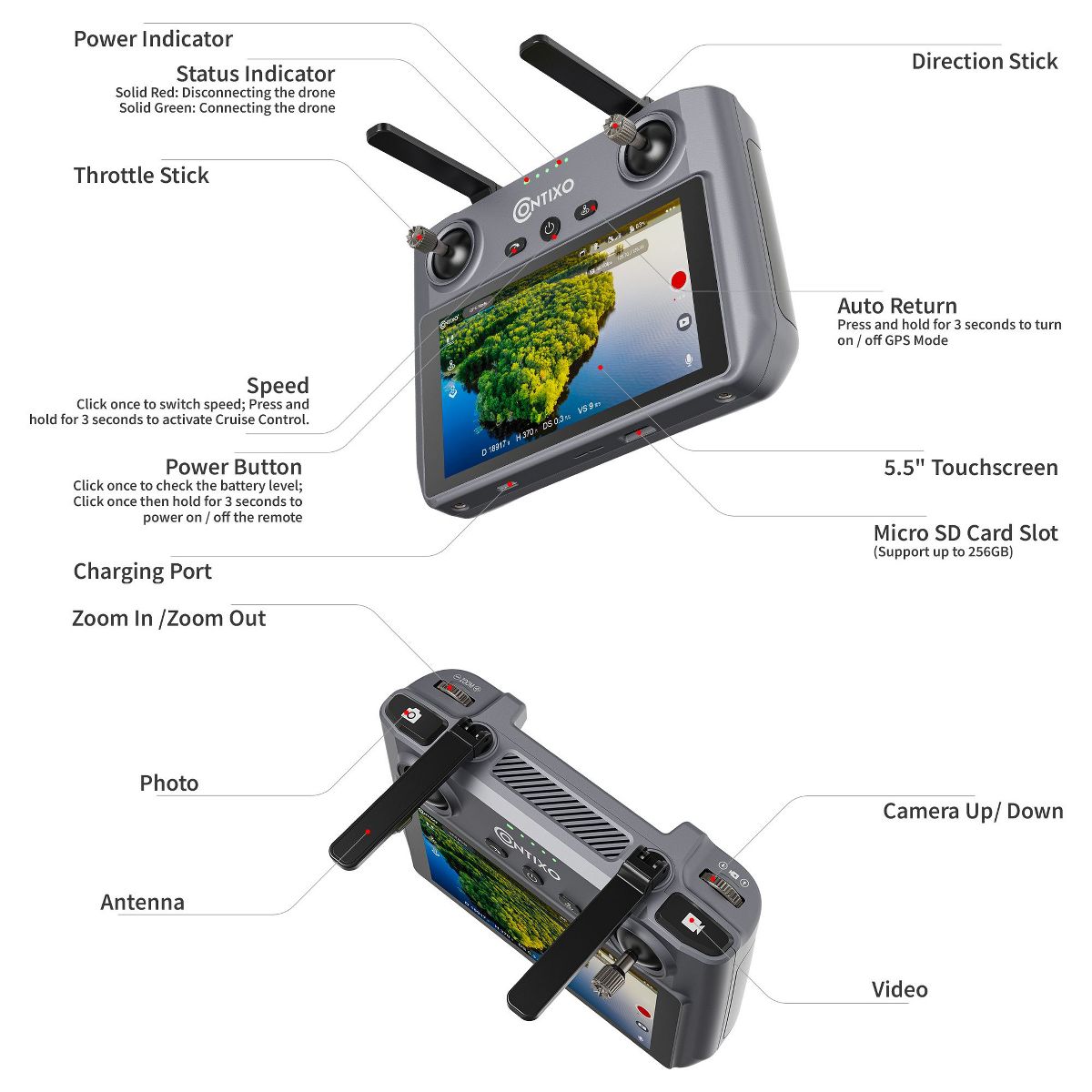 Explore the sky with confidence using the Contixo 4K GPS Drone for Adults. The camera drone is designed for smooth performance, intelligent control, and high-quality imaging. The 4K UHD camera captures sharp 3840×2160 photos and video with a 100° wide-angle lens and 80° adjustable tilt. A 2-axis mechanical gimbal with Electronic Image Stabilization delivers steady, shake-free footage for clear, cinematic results. The camera drone flies longer with up to 40 minutes of flight time per battery, The total flight time is about 160 mins. The FPV drone is powered by efficient brushless motors for quiet operation and stable control. GPS-assisted flight modes like Follow Me, Orbit Mode, and Return-to-Home help automate complex movements while maintaining precise positioning. Safety features of this gps drone include front-side laser obstacle avoidance, One-Key Takeoff and Landing, and Optical Flow positioning for accurate hovering. A 5.5-inch HD touch screen remote provides real-time FPV viewing, and a 32GB SD card is included so you can start capturing aerial footage right away.