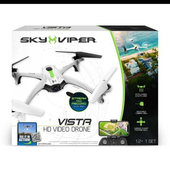 Stream live POV footage straight to your phone—just like the pros. Vista’s adjustable camera pivots forward for fast-flying action, or tilts down to capture the scenery below. Just download the free Sky Viper SE Video Viewer app (App Store or Google Play—Required for streaming, not for flight). Clip your phone to the remote like a heads-up display and go! Record on your phone to watch and share later. Vista’s advanced autopilot makes flying easy, even if it’s your first time. Launch and land with the press of a button. Surface Scan™ optical flow sensors track the ground below, locking in position for drift-free hover. Once you’ve got the perfect shot, you can even switch flight modes to boost agility and unleash Vista’s sporty side. Minimum age: 12 years. For teens and adults. Product net content: 1 unit. Set also Includes a 2.4 GHz transmitter, removable high-performance LiPo battery, USB charging cable, extra propellers, and instructions.