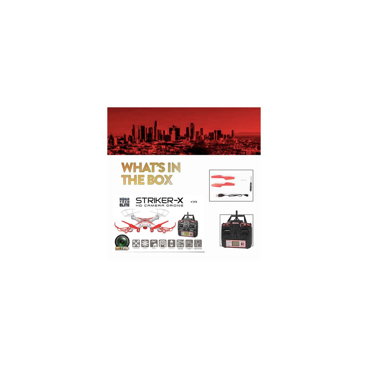 Take over the sky with the World Tech Toys Striker-X 2.4GHz 4.5CH RC HD Camera Drone! This awesome RC camera drone lets you record videos and take pictures with its amazing HD 720p Camera at the push of a button. The Striker-X also has 4.5 channel controls meaning you can fly multi-directional and with internal gyro you'll always get a smooth flight. It also comes with a 2.4GHz transmitter, so radio interference won't be a problem. Enjoy recording high flying fun with the World Tech Toys Striker-X 2.4GHz 4.5CH RC HD Camera Drone!