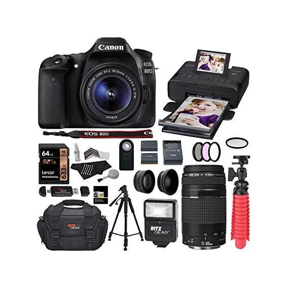 Canon 80D DSLR Camera EF-S 18-55mm is STM Kit with EF 75-300mm III Telephoto Lens and Canon Selphy Printer CP1300 Printer (Black), Lexar 64GB U3 Memory Card Bundle