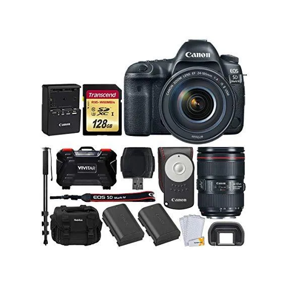 Canon EOS 5D Mark IV DSLR Camera + EF 24-105mm f/4L is II USM Lens + Transcend 128GB SDXC Memory Card + Canon RC-6 Wireless Remote + Canon Battery Pack LP-E6N + DC59 Gadget Bag + Accessories