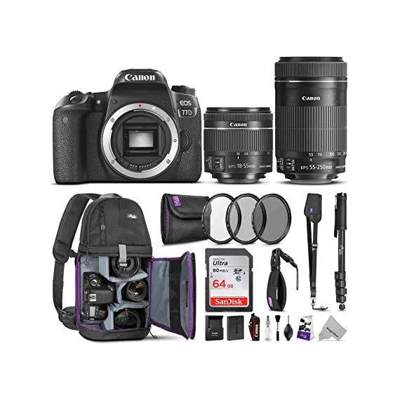Canon EOS 77D DSLR Camera with 18-55mm is STM and 55-250mm Lenses Kit w/Advanced Photo and Travel Bundle - Includes: Canon USA Warranty, Altura Photo Backpack, SanDisk 64gb Card, Monopod, Filter Kit
