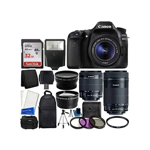 Canon EOS 80D DSLR Camera Body + Canon EF-S 18-55mm is STM & Canon EF-S 55-250mm is STM Lens + 58mm 2X Lens + Wide Angle Lens + 32GB Memory Card + Auto Power Flash + UV Filter Kit + Accessory Bundle