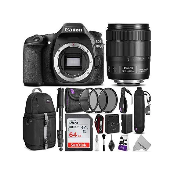 Canon EOS 80D DSLR Camera with EF-S 18-135mm f/3.5-5.6 is USM Lens w/Advanced Photo & Travel Bundle - Includes: Altura Photo Backpack, SanDisk 64gb SD Card, Monopod, Filter Kit and Neck Strap