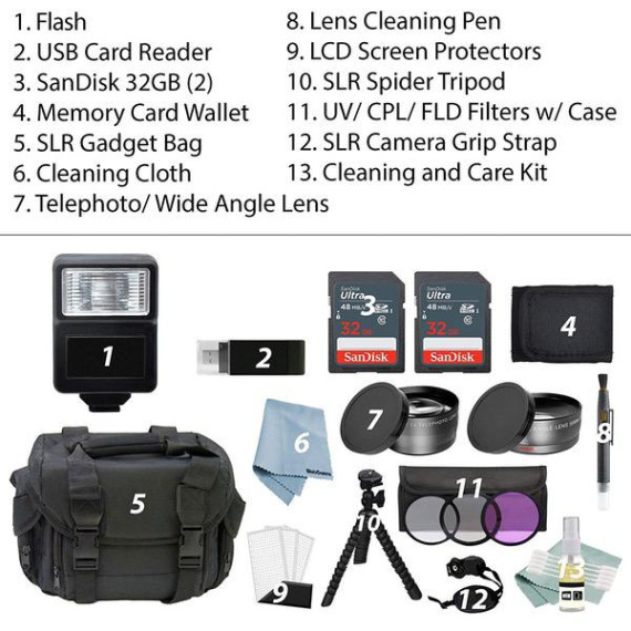 UPDATE: I contacted the seller about the missing items and the fake memory disk and within a few hours I received an email and a call apologizing for the mistake and telling me they were shipping the missing items. All of the missing items arrived within two days. I am very pleased with the customer service. Original review: I ordered this about a month ago and I have already used the camera lots and I love it. Unfortunately the bundle is not what it says it would be. I only received a few of the items that are listed in the bundle. I did not receive the following items: - High Resolution 0.45X Wide Angle Lens W/Macro Telephoto Lens - (2) SanDisk 32GB Cards (I only received 1) - USB Card Reader - Auto Power Pro Slave Flash - Memory Card Wallet - Lens Pen The biggest disappointment here is the SD cards. First of all, I only received one card even though two are listed. Secondly, the one I received is not an authentic SanDisc cards, I have had lots of issues with it and I have lost a few files, but now its not even recognized on my computer or my camera. I did some research and it looks like its not an actual SanDisc card - you can tell because the lock switch is yellow. I am very happy with the camera and very, very disappointed with the bundle.