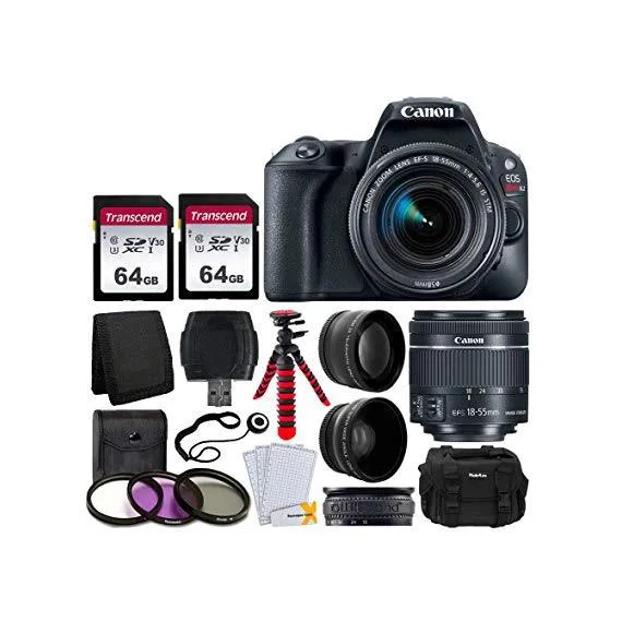Canon EOS Rebel SL2 Digital SLR Camera + EF-S 18-55mm f/4-5.6 IS STM Lens + 58mm Wide Angle & Telephoto Lens + 2x 64GB Memory Card + DC59 Gadget Bag + 12” Flexible Tripod + UV Filter Kit + Accessories