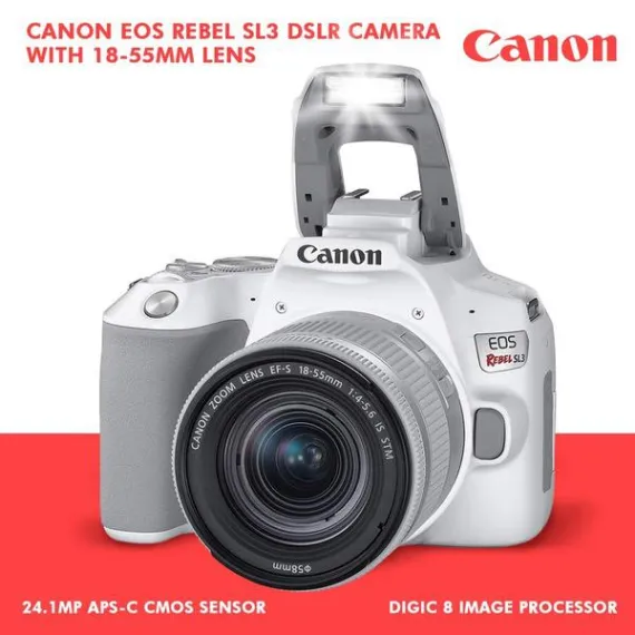 Canon EOS Rebel SL3 DSLR Camera (White) with 18-55mm Lens + Telephoto & Wideangle Lens + 64GB + Cases + Filters and Premium Accessory Bundle