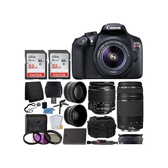 Canon EOS Rebel T6 Digital SLR Camera, 18-55mm EF-S Lens, EF 75-300mm Lens, SanDisk 64GB Card, Telephoto and Wide Angle Lens, Extra Battery, 58mm UV Filters, Gadget Bag with Bundle Accessories