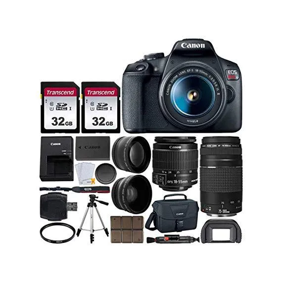 Canon EOS Rebel T7 Digital SLR Camera + EF-S 18-55mm f 3.5-5.6 is II Lens + EF 75-300mm f/4-5.6 III Lens + EOS Shoulder Bag + 32GB Memory Card + 58mm Wide Angle & Telephoto Lens + Tripod + UV Filter
