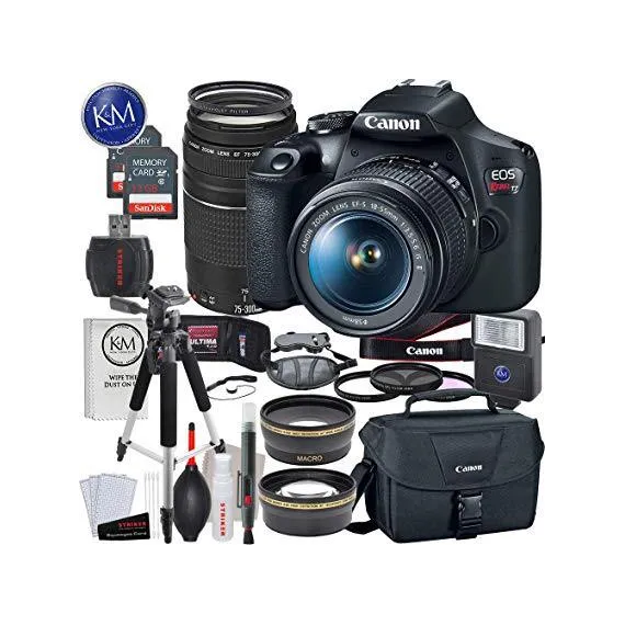 Canon EOS Rebel T7 DSLR Camera w/EF-S 18-55mm Lens + EF 75-300mm Lens + 2 x 32 GB Memory + Deluxe Bundle