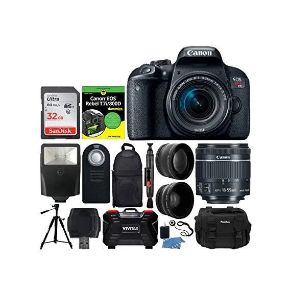Canon EOS Rebel T7i DSLR Camera + EF-S 18-55mm IS STM Lens + 32GB Memory Card + Wide Angle & Telephoto Lens + Photo4Less DC59 Case + Dummies Book + Slave Flash + Wireless Remote + Tripod – Full Bundle