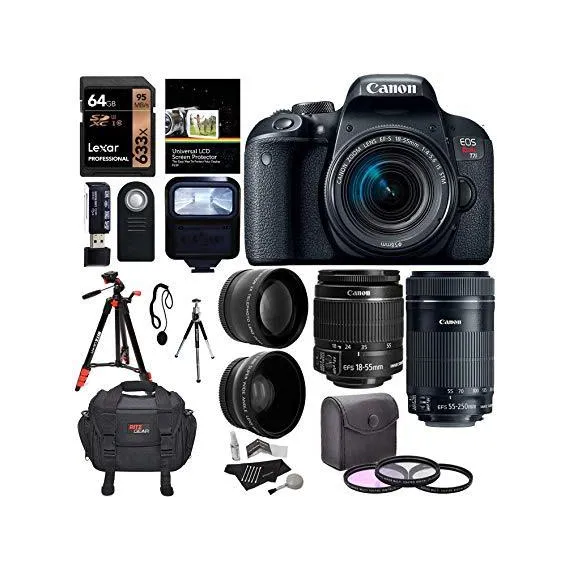 Canon EOS Rebel T7i EF-S 18-55 is STM Kit, EF 55-250mm II, 64GB U3 Memory Card, Wide Angle, Telephone Lens, 48" Tripod and Accessory Bundle