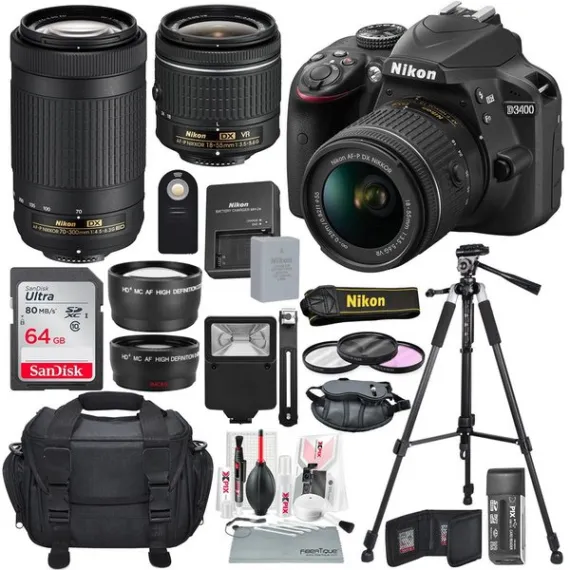 Make sure this fits by entering your model number. NIKON AUTHORIZED DEALER. 1 Year Limited Warranty. Nikon D3400 Digital SLR Camera + Nikon AF-P DX NIKKOR 18-55mm f/3.5-5.6G VR Lens. INCLUDES: 55mm 0.43x Wide Angle Lens / 2.2x Telephoto Lens / Flash / 57" Aluminum Tripod / 32 Gb SDHC / Camera Case / Memory Card Wallet /55mm 3 Piece Filter Kit / Wrist Strap / Lens Cap Keeper / Wireless Remote Control / Screen Protector / Card Reader DELUXE CLEANING KIT included in the bundle to help you maintain your photo equipment safely and effectively STUNNING SIMPLICITY: Photos and videos captured with the D3400 and a superb NIKKOR lens are as vibrant as the moments they preserve. Shoot in extremely low light without a problem. Create portraits with rich, skin tones and beautifully blurred backgrounds. HIGH-PRECISION LENS: The AF-P system brings with it a pulse stepping motor AF system that is fast and quiet. This model also offers Nikon's Vibration Reduction image stabilization which limits the effects of camera shake.
