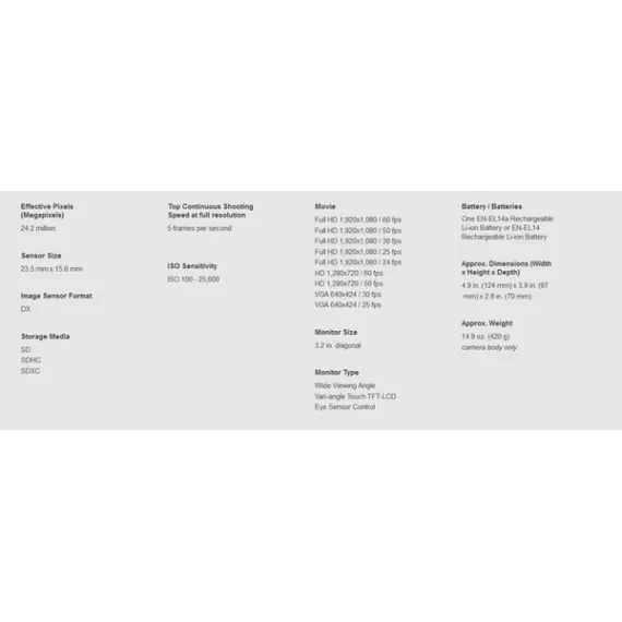 Make sure this fits by entering your model number. 24.2-megapixel image sensor with no optical low-pass filter for staggering sharpness Compact design with swiveling touchscreen Vary-angle LCD display Built-in Wi-Fi connectivity for instant photo sharing with a compatible smartphone or tablet Full HD 1080/60p video recording with advanced movie features Creative in-camera filters and effects, built-in HDR, time lapse, interval shooting and more