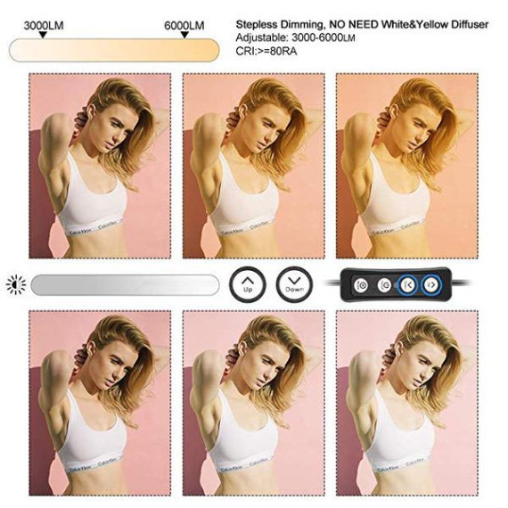 - √【3 Light mode,11 Brightness Switch】Find circle lights with more light adjustment for photo? Our makeup led ring light has 64pcs led light bulbs offer more bright light to you.3 colors lighting mode: white, warm yellow, and warm white. Each lighting mode has 11 adjustable brightness to choose, ring light with stand meets all your lighting requirements.