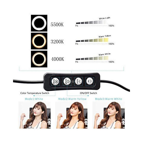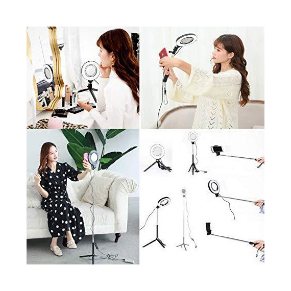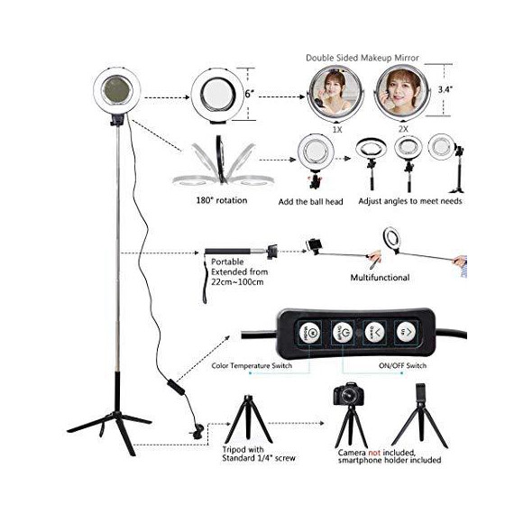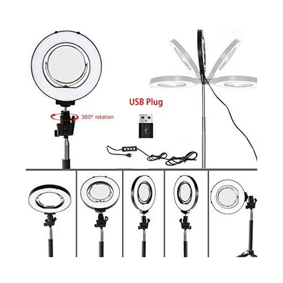 Dimmable Ring Light with Adjustable Height Light Stand,Selfie Stick and USB Plug,6" 3200K~5500K Beauty Table Top Lamp with Makeup Mirror,Mini Tripod and Phone Clamp, Perfect for Vlogs,YouTube Channel