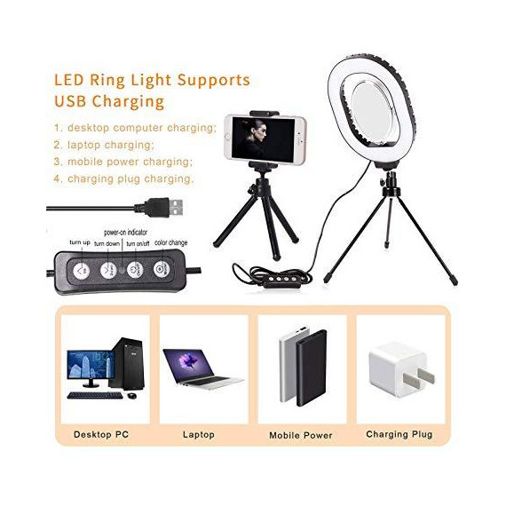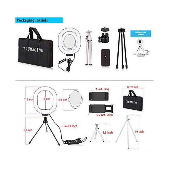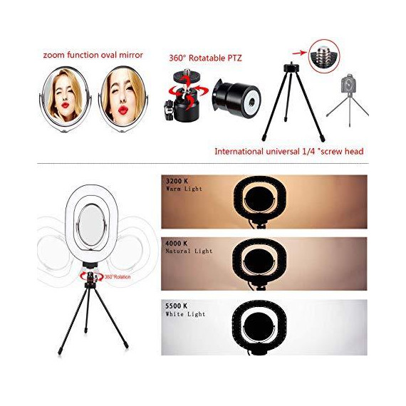 Make sure this fits by entering your model number. 【Dimmable 7×6" Oval LED Ring Light】3 colors lighting mode: White Light ,Natural Light ,and Warm Light. Each mode dimmable from 1% to 100%, it's easy to control both color and brightness with the in-line switches.whenever you need extra light for making up, taking photos, making videos, reading books, and live streaming,it will come in handy!Made of 35 energy-saving LED white beads+35 energy-saving LED warm beads and high-transmission ABS housing, it has good heat dissipation performance. 【USB Powered LED Beauty Light】The ring light works with most devices that support USB port, like laptop, PC, power bank, USB charger, AC adapter, and etc.Evening outdoor fill light can be used for taking photos/videos, etc.Easy to carry and Easy control on cord to power on/off or switch to the lighting mode you prefer.Please pay attention to the size when purchasing. 【360° Rotation and Multifunction】The selfie ring light can 360 degree rotating.with Internationally common 1/4" screw head,can be used with other accessories.You can adjust the angle to provide the perfect light as needed. For make-up, live streaming, facebook video, selfie photos, filming, video recording, online teaching,youtobe video etc,or just works as desk tabletop lamp. The phone holder and ring lights are easy to carry, which make your life easier and colorful. Best gift for traveling. 【360° Rotation and Multifunction】The selfie ring light can 360 degree rotating.with Internationally common 1/4" screw head,can be used with other accessories.You can adjust the angle to provide the perfect light as needed. For make-up, live streaming, facebook video, selfie photos, filming, video recording, online teaching,youtobe video etc,or just works as desk tabletop lamp. The phone holder and ring lights are easy to carry, which make your life easier and colorful. Best gift for traveling. 【Money Back Guarantee】100% Money Back Guarantee Or Ship You A Replacement,High quality, always keep a timely and friendly customer service response, please feel free to contact us if you have any questions, we will give you a satisfactory answer,please rest assured to buy! 【Package information】:1 x 7×6 inch Oval Ring Light with USB plug,1 x Strong Tripod,1 x Multifunction Mirror,1x Table Mini Tripod with Smart Phone Holder,1x 360° Ball Head Mount ,1x Portable Carrying Case,1x Instruction manual.