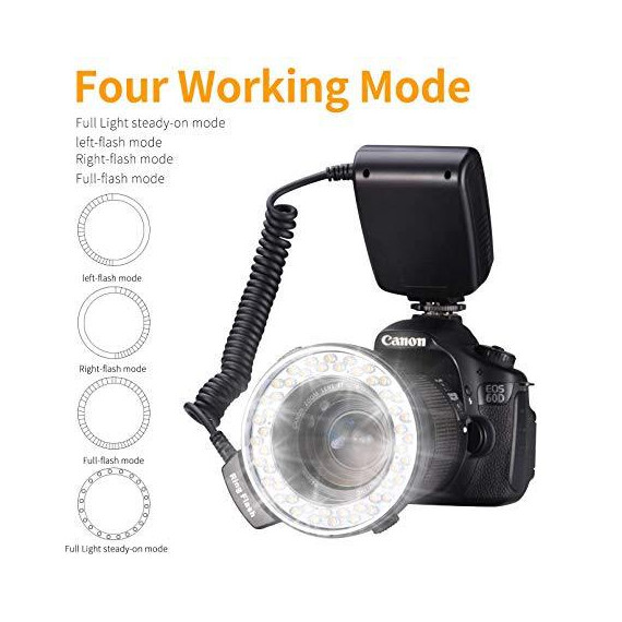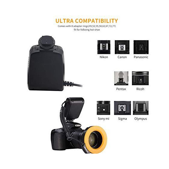 Make sure this fitsby entering your model number. This flash light is specially designed to use in the field of macro-shot, scientific research, medical and personal photography in a very close distance shooting. Our ring flash Consists of 48 pieces LED, higher luminance and lower static power consumption. The ring flash fits for any model of Nikon or Canon DSLR. It can provide continuous and stable semi light or full light to meet higher photograph needs. There are 8 Mounting rings adapter suit for 49, 52, 55, 58, 62, 67, 72, 77mm lenses.