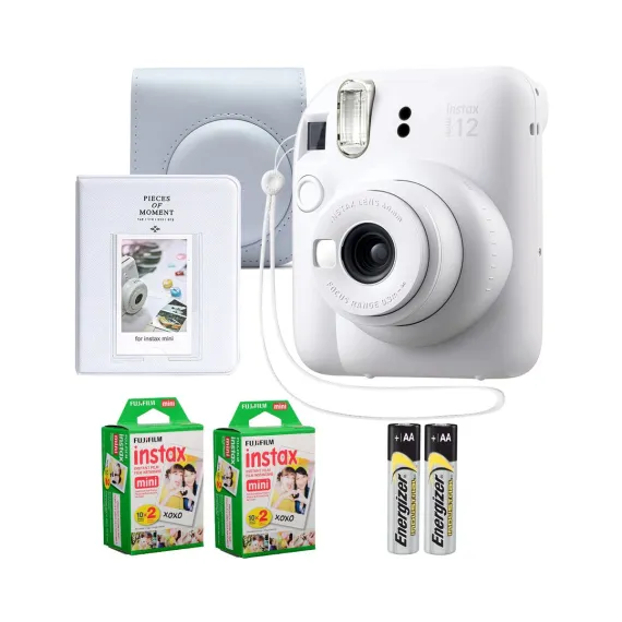 Fujifilm Instax Mini 12 Instant Camera Clay White Bundle – Includes 40-Sheets Instax Mini Film, Protective Case, and Mini Photo Album