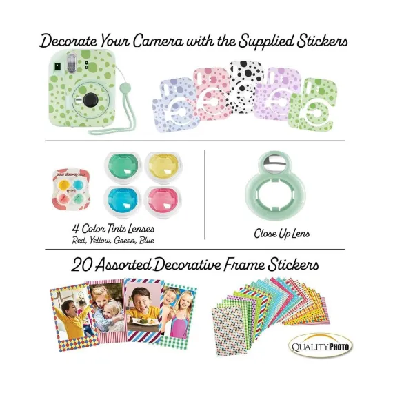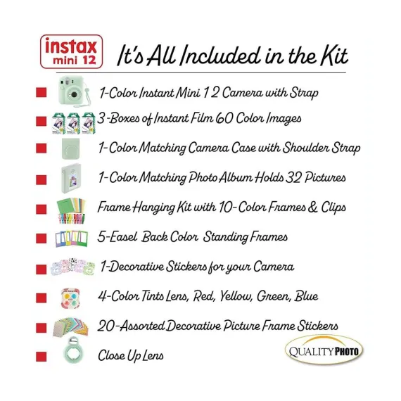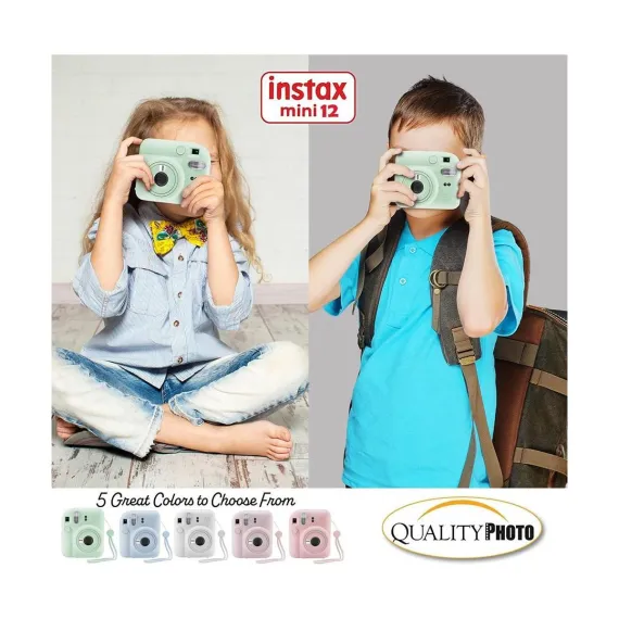 Value accessory bundle. Includes the famous Fujifilm Instax Mini 12Camera (color your choice) with a matching Camera Case to keep the camera protected. 60 Fujifilm Instax Films so you can use your brand new camera right away! Photo Album, perfectly sized for the instant prints. Many more accessories including frames to hang and decorate you photos, stickers, close up color lenses, and camera sticker for added color. The newly updated Fujifilm instax Mini Camera 12 features a slim body with newest design. Parties, birthdays anniversaries, carnivals or gifts... all are times to use the Fujifilm Instax Camera, You will not regret the Mini 12 buy. The most valued gift bundle for the best price!