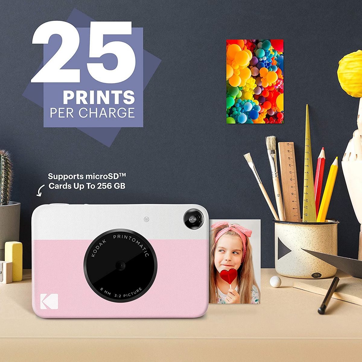 The Kodak Printomatic Mini Instant Camera prints smudge-proof, water- and tear-resistant photos up to 5 MP automatically. With this Kodak instant camera, you just point, shoot, and print. Perfect for taking on the go, whenever you want to share prints, the Kodak Printomatic Wireless Mini Instant Camera is the easiest way to share photos with friends. This mini digital camera's compact design slips neatly into your shirt pocket. The portable camera speed even allows you to continue shooting while your photo is printing. The "Insta Camera" Zero Ink technology means you don't need to worry about messy print cartridges, film, or toner. With this instant picture camera your prints are adhesive-backed, so you can get creative and use the photos to decorate, just as you would any sticker. No USB cable is included.