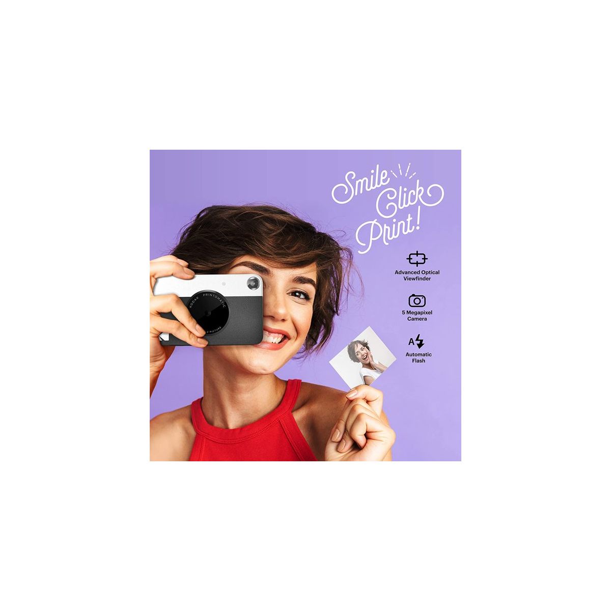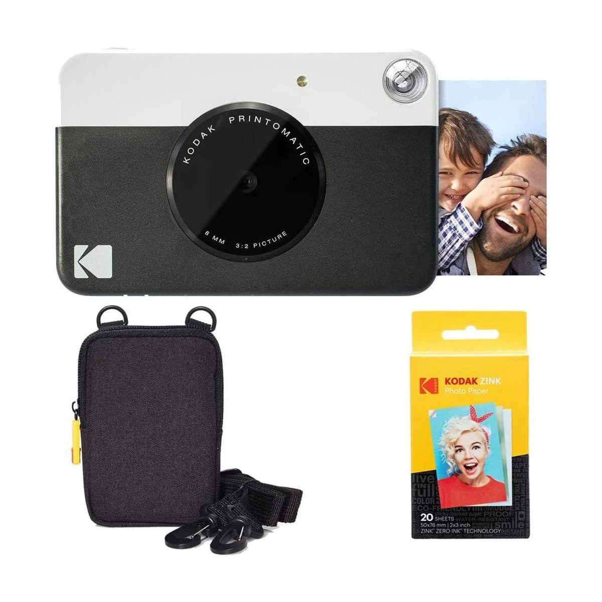 The Kodak Printomatic Mini Instant Camera prints smudge-proof, water- and tear-resistant photos up to 5 MP automatically. With this Kodak instant camera, you just point, shoot, and print. Perfect for taking on the go, whenever you want to share prints, the Kodak Printomatic Wireless Mini Instant Camera is the easiest way to share photos with friends. This mini digital camera's compact design slips neatly into your shirt pocket. The portable camera speed even allows you to continue shooting while your photo is printing. The "Insta Camera" Zero Ink technology means you don't need to worry about messy print cartridges, film, or toner. With the included carrying case you can take this Kodak instant camera everywhere with you. With this instant picture camera your prints are adhesive-backed, so you can get creative and use the photos to decorate, just as you would any sticker.