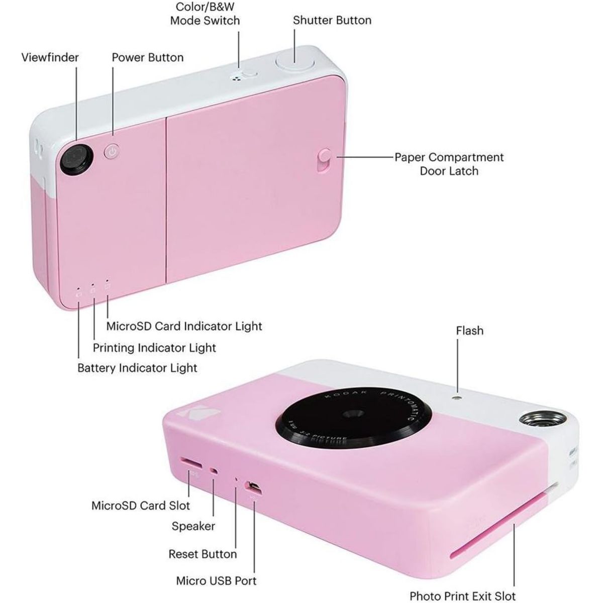 The Kodak Printomatic Mini Instant Camera prints smudge-proof, water- and tear-resistant photos up to 5 MP automatically. With this Kodak instant camera, you just point, shoot, and print. Perfect for taking on the go, whenever you want to share prints, the Kodak Printomatic Wireless Mini Instant Camera is the easiest way to share photos with friends. This mini digital camera's compact design slips neatly into your shirt pocket. The portable camera speed even allows you to continue shooting while your photo is printing. The "Insta Camera" Zero Ink technology means you don't need to worry about messy print cartridges, film, or toner. With the included carrying case you can take this Kodak instant camera everywhere with you. With this instant picture camera your prints are adhesive-backed, so you can get creative and use the photos to decorate, just as you would any sticker.
