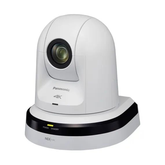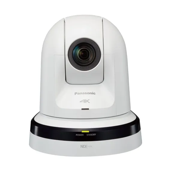 The white Panasonic 20x Zoom 4K PTZ Camera with 3G/HD/SD-SDI & HDMI Output and NDI Output 4K UHD, HD, and SD video over a variety of connections. It features a 1/2.3" 3MOS sensor and outputs over 3G/HD/SD-SDI, HDMI, or you can use the NDI protocol to stream video and audio, control (IP), tally, and power over a single Ethernet cable. When connected to the Internet, this IP camera allows you to control PTZ actions and monitor the surveillance area from a remote location via a Web browser. This provides you with several advantages like reduced integration costs, easy remote production and engineering, and lower cost for multiple location systems.