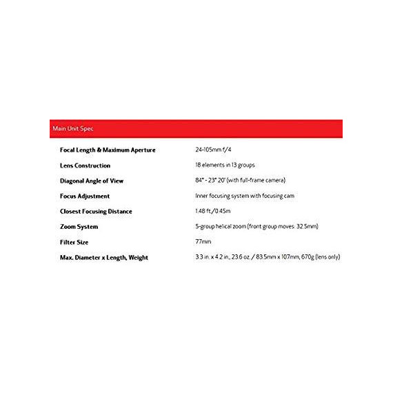 Make sure this fits by entering your model number. 24-105mm standard zoom lens with f/4 maximum aperture for Canon EOS SLR cameras, Macro Focus Range : 0.45 m 1 Super UD glass element and 3 aspherical lenses minimize chromatic aberration and distortion Ring-type USM system delivers silent but quick autofocus (AF); full-time manual focus Image Stabilizer technology steadies camera shake at up to 3 stops; weighs 23.6 ounces Dust- and moisture-resistant; measures 3.3 inches in diameter and 4.2 inches long; 1-year warranty