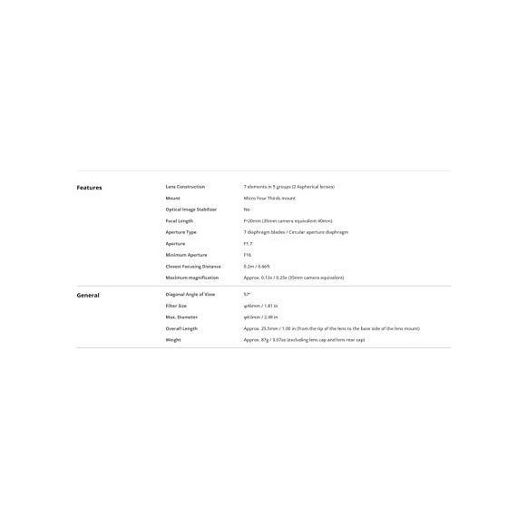Make sure this fits by entering your model number. 20mm focal length, equivalent to 40mm on a 35mm film camera Closest Focusing Distance : 0.2m / 0.66ft, Maximum magnification Approx. 0.13x / 0.25x (35mm camera equivalent) F1.7 brightness for beautiful, soft focus, Comprised of seven lenses in five groups Used with Lumix G Micro System Cameras, allows for use of the advanced contrast Auto Focus (AF) system Lens not Zoomable