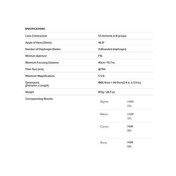 Make sure this fitsby entering your model number. 50mm focal length 75mm equivalent focal length on APS-C cameras, 80mm equivalent focal length on Canon APS-C cameras F1.4 maximum aperture; F16 minimum Ring-type ultrasonic-type AF motor with full-time manual focusing 77mm filters 0.4m/15.7" minimum focus Available in Canon EF, Sony Alpha, Sigma SA, Nikon F (FX) mounts