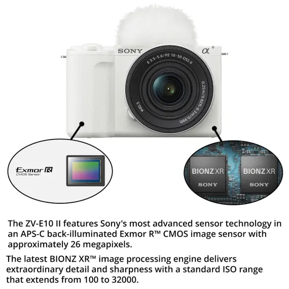 The Sony Alpha ZV-E10 II Camera and 16 to 50mm Lens Kit in White feature Sony's most advanced sensor technology in an APS-C back-illuminated Exmor R CMOS image sensor with approximately 26.0 megapixels. Perfect for capturing every moment..