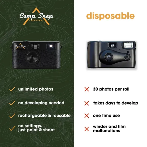 Meet Camp Snap, the screen-free digital camera that’s gone viral for a reason. Designed to help you capture the moment without missing it, Camp Snap gives you the nostalgic joy of film-style photography—minus the film and waste.