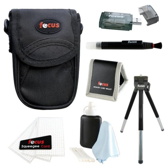 It came with everything noted, but also with the shoulder strap for the camera case, which one reviewer mentioned they didnt get. Most of this stuff I dont know what to do with, so will leave in their boxes until I figure them out ("USB multicard reader/writer", tripod (extends to 8 "), LCD/lens cleaner, memory card wallet, SanDisk Ultra 32GB SD Card (it says 16 mp photo/7 mb file size = 2000 and video (mpeg-4/H.264, 1920x1080 @30fps) in minutes = 40), and some odd Focus Squeegee card w fluid and Qtips and a floppy card w a grid and ruler printed on it (does anyone know what this stuff is for?), 1 battery, the charger (also a charger for the car and a converter for European plugs!). Even though I dont know what everything is, it is still a good deal for a small point and shoot camera. And it is definitely a very small camera, but thats how they come, these days.