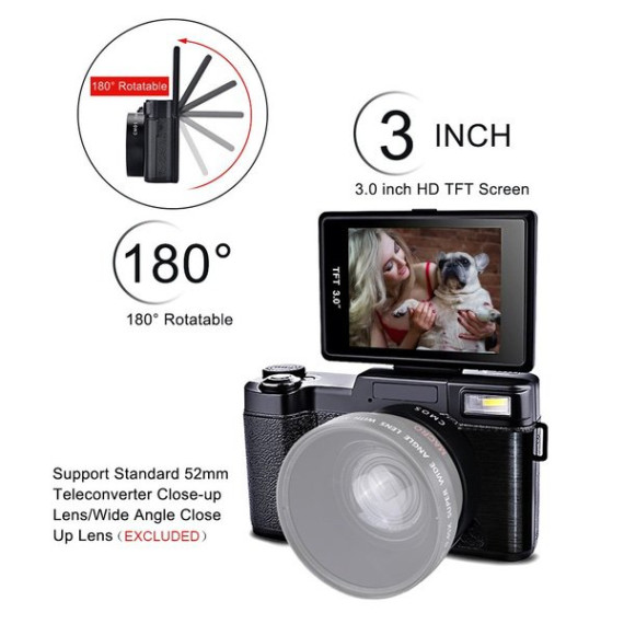❤This point and shoot digital blogging camera supports standard 52mm wide angel lens, fisheye lens and teleconverter lens. It will meet diversified requirements of photography by connecting with different lenses(Need to purchase seperately).You can mount this camcorder on a tripod so that you can do some vlogging.(Tripod is excluded in the package).