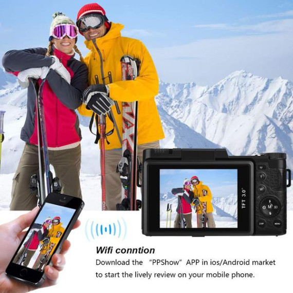 ❤This digital camera with wifi supports full 2.7K UHD@30pfs video resolution and 24MP picture resolution with good image quality. Also it supports wifi function. Download the “PPShow” APP on your phone so that you can view the pictures and videos on your phone directly. It has 4X digital zoom which makes you clearly see the scenery near or far away. You can press the W/T button to zoom in or out to look further. It is easy to switch between "Video" and "Picture" MODE by pressing the "M" key.
