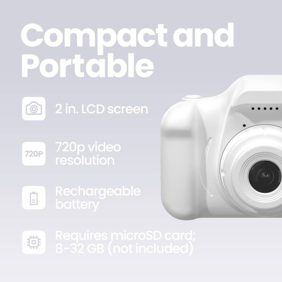 The GEMS Mini Digital Camera makes capturing everyday moments simple and fun. The 2 inch LCD screen allows you to preview and frame your pictures with ease. It snaps clear 2MP photos and records 720p videos, perfect for sharing memories with friends and family. The rechargeable battery and included charging cable keep you ready to capture any moment, while the compact design fits easily into a pocket or bag. Just add a micro SD card (8–32GB) and you’re ready to start recording life’s little adventures with the GEMS Mini Digital Camera.