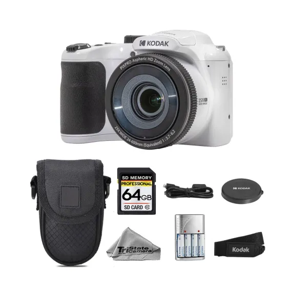 Kodak PIXPRO AZ255 Digital Camera (White) + Extra Battery + Case -64GB Kit