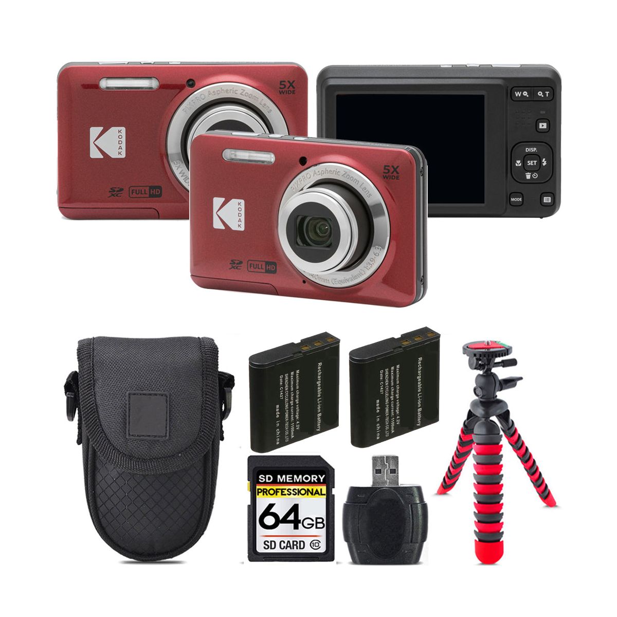 Kodak PIXPRO FZ55 Digital Camera (Red) + Extra Battery + Tripod + 64GB Kit Product Description Capture sharp photos and smooth HD videos with the compact and easy-to-use Kodak PIXPRO FZ55 Digital Camera. This value-packed TriStateCamera Saving Bundle includes essential accessories to keep you shooting wherever you go. TriStateCamera Saving Bundle Includes: