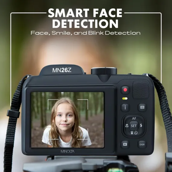The MN26Z packs a punch with its powerful 26x optical zoom capability. It shoots both long distances and close-ups in crisp detail and convenient optical stabilization features helps keep photos steady when camera shake is detected. User-friendly features like face, smile, and blink detection make it easy to capture the perfect photo and a variety of 13 scene modes including Night Portrait, Panorama and Sunset make it simple to shoot in any setting possible. Includes WiFi for easy integration with your smartphone.