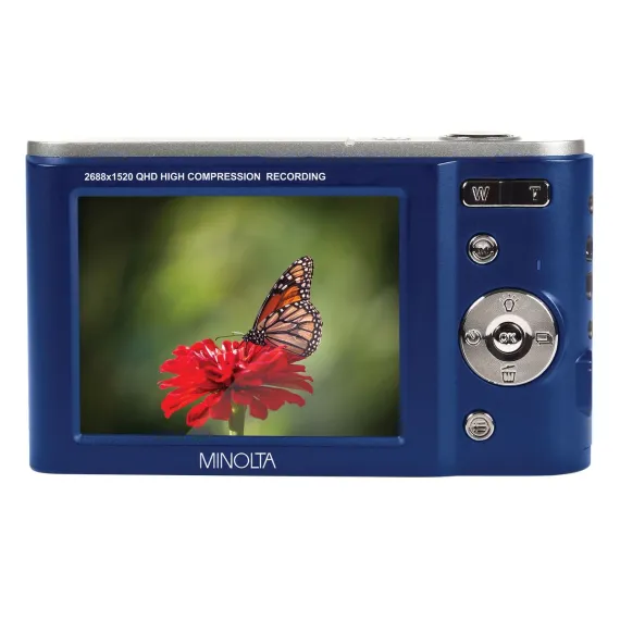 Preserve the moment with Minolta’s Silver MND20 Digital Camera and its high-resolution photos that are suitable for cropping or enlarging thanks to the 44 MP photo resolution. And its 2.7K Quad HD video gives your video greater vividness and clarity than standard-definition video. Featuring a compact size with anti-shake stabilization, you can easily compose shots and review photos with the 2.9-in. LCD monitor. Capture close-up details or shoot from a distance with the 16x digital zoom lens. Intelligent scene modes and features like smile capture and photo burst make shooting the ideal shot easy and fun.