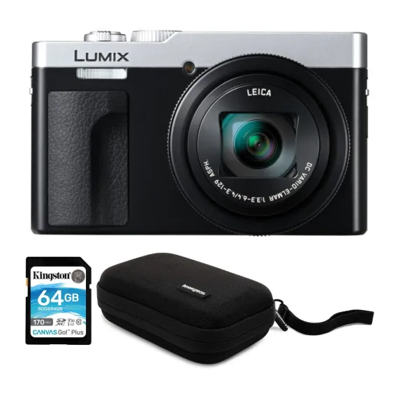 Panasonic LUMIX ZS99 30x Zoom Point and Shoot Compact Digital Camera for Travel and Concert (Silver)Take the Panasonic LUMIX ZS99 Compact Point-and-Shoot Camera in Silver with you to your next concert and be amazed by the stunning resolution of this 30x zoom camera that's made for people who are always on the move, capturing life's moments with ease. Perfect for travel enthusiasts, this compact camera is not just travel-friendly with its pocket-sized dimensions but is backed by 5-Axis HYBRID O.I.S. Plus technology that ensures steady shots, whether you're capturing your next hiking moments or videos of yourself while dancing at a beach party. The camera's specifications are sure to enthrall - 4K photo and 4K video deliver breathtaking clarity, and the tiltable 1,840k-dot monitor is user-friendly and perfect for sharing moments instantly. Built-in Bluetooth and Wi-Fi connectivity makes it easy to share capture moments instantly and universal USB Type-C charging makes it easy to power up no matter where your globetrotting self takes you.Compact PowerhouseThe Panasonic LUMIX ZS99 Compact Point-and-Shoot Camera features a 24-720mm LEICA lens with 30x Zoom despite its compact body.Sharp and Detailed ImagesShoot high-quality 4K video at 30p or take quick bursts of 4K PHOTO at 30fps. Capture high-speed video at 120fp to get creative with slow-motion videos.Quick SharingWith built-in Bluetooth v5.0 featuring a dedicated Send Image button, transfer your photos and videos to your smartphone and gain access through the Panasonic Image App for quick and seamless sharing.Kingston 64GB SDXC Canvas Go Plus 170MBPS Read Memory CardKingston 64GB SDXC Canvas Go Plus is for adventurers who are always on the go chasing the perfect moment to capture. With superior transfer speeds of up to 170MBPS, the Canvas Go Plus SD card accelerates your workflow and efficiency so that you’ll have more time to take your creativity onto the next adventure.Seamless and ConsistentWith U3 and V30 speed performance, shoot stunning 4K Ultra-HD videos without worrying about slow speeds and dropped frames, or shoot sequential burst-mode photography that’s seamless and consistent. View the world as your canvas and take your creativity and inspiration on the road with the Canvas Go Plus SD.Knox Gear Hardshell Travel Organizer and Storage Case for Small Electronics and AccessoriesThe Knox Gear Hardshell Travel Organizer and Storage Case is designed for use with hard drives, MP3 players, power banks, small electronics and accessories.Protective CaseReplacing the Knox Gear Hardshell Travel and Protective Case for Sony ICF-P26 Portable Radio, the Knox Gear Hardshell Travel Organizer and Storage Case will fit any similarly-sized small electronics and accessories. It is a water, dust, splash, impact and shock-resistant hard case constructed using hardshell EVA material.Easy to UseThe Travel Organizer and Storage Case features an internal mesh compartment for battery and earbud storage. It also has a carabiner clip for easy attachment to a bag or belt loop..