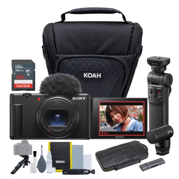 Sony ZV1 II Vlog Camera, ACCVC2 Accessory Kit, Koah Case and Card Reader with Memory Case (Black)Sony ZV-1 II Vlog Camera (ZV1M2/B)Compact, powerful, and made for vlogging, the Sony ZV-1 II makes content creation effortless. Featuring a wide-angle 18–50mm zoom lens and a large 1.0-type sensor, it captures everything from group shots to cinematic close-ups in stunning detail.Create standout visuals with My Image Style and Creative Look presets, or shoot in true movie style using the Cinematic Vlog Setting, all with simple touch controls. The Intelligent 3-Capsule Mic ensures clear audio by automatically adjusting pickup direction, and the included windscreen reduces outdoor noise.Weighing just 10.3 oz (292g), it’s easy to take anywhere. Features like Real-Time Eye AF, Touch Tracking, Product Showcase Mode, and Active Mode image stabilization keep your videos sharp, focused, and smooth every time.Sony ACCVC2 Vlogger Accessory KitEnhance your content creation with the Sony Creator Accessory Kit II, featuring the GP-VPT2BT Wireless Shooting Grip and ECM-G1 Shotgun Microphone. The grip offers wireless camera control, tilt/rotate functions, and transforms into a tripod—ideal for vlogging and versatile shooting. The compact, high-quality mic captures clear, directional sound with a windscreen for outdoor clarity.Koah Holster Camera Case and Accessory Bundle for DSLR, Mirrorless, and CamcordersProtect and maintain your DSLR, mirrorless, or camcorder gear with this all-in-one bundle. It includes a durable, water-resistant holster case with padded interior, adjustable dividers, and multiple carrying options.Also included: a compact mini tripod (doubles as a hand grip), microfiber cloth, lens cleaning wipes, spray, air blower, fine brush, wrist straps, and a carrying pouch, everything you need for safe storage and pro-level camera care on the go.Koah PRO 2-in-1 Aluminum Shell OTG Dual Slot SD Card ReaderRead your memory cards easily on the go with the Koah PRO 2-in-1 Aluminum Shell On-The-Go Dual Slot SD Card Reader! Its aluminum shell is durable and gives it a sleek look.This Dual Slot SD Card Reader is a USB 3.1 and USB Type-C Card Reader compatible with up to 512GB capacity cards. It has two slots, one for Micro SD cards and another for SD/SDHC/SDXC cards. The OTG capability allows this reader to be plugged into USB Type-C capable smartphones.Koah Pro Rugged Memory Storage Carrying CaseFits up to 3 XQD/CFExpress and 6 SD CardsThere is nothing more important than keeping your images and videos stored on your memory cards safe from the elements. The best way to keep them protected is with the KOAH Pro Rugged Memory Storage Carrying Case.This case features a waterproof molded rubber interior lining that keeps your memory cards securely in place. It can hold up to 3 XQD/CFExpress and 6 SD cards in one case and features an ergonomic locking system.The case can take whatever life throws at it. It has a resilient ABS case exterior and a waterproof inner lining, allowing it to take any splashes or falls that may happen..