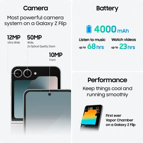- Capture Life's Moments Effortlessly: The Galaxy Z Flip 6 boasts an advanced camera system with a 50MP rear camera, 4K video recording, and innovative features like FlexCam and Camcorder Mode. Powered by Galaxy AI, it automatically frames shots, enhances colors, and offers creative controls for capturing stunning photos and videos with ease.