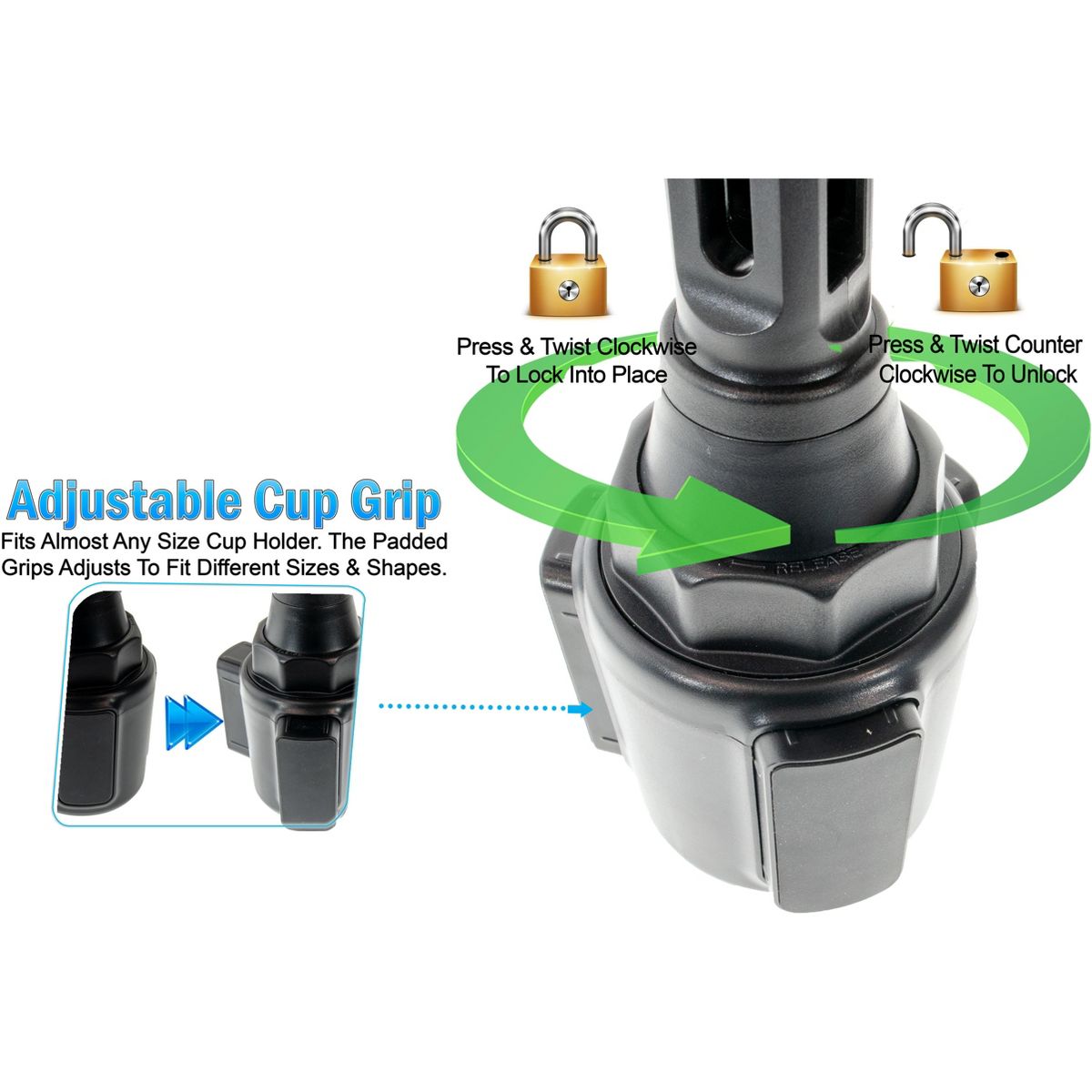 The diameter of the cup holder phone holder base is adjustable from 2.5" to 3.5", which will fit most car cup holders. Please measure the size of your car cup holder before purchase to make sure it will fit. Compatible with all cell phones and devices between 2.1"-4.0" width and within 0.6" thickness. No extra tools are required to install the cell phone holder for car cup holder. Assemble it in seconds simply put it in the car cup holder, twist the knob to fit, then you could put your phone in and enjoy your drive. To release or lock your cell phone on the car cup holder phone mount, just press the button on the back or squeeze the clip arms with one hand.